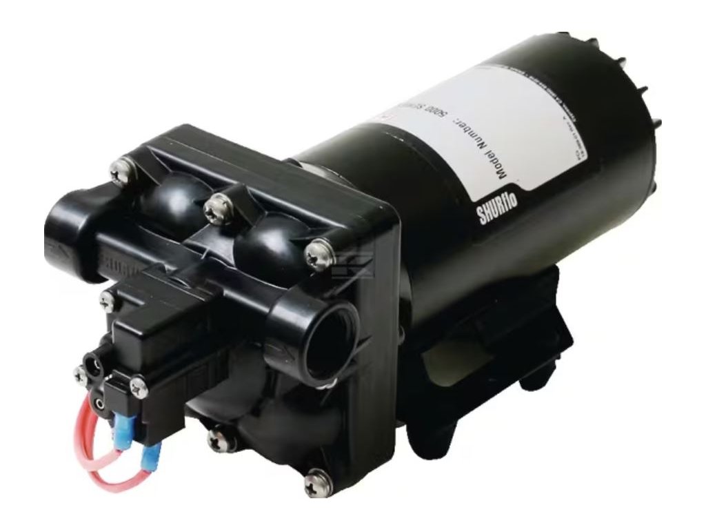 Membránové čerpadlo SHURflo pro karavany. Určeno pro čerpání vody, max.výkon 6,8 l/min, max. 1,4 bar, možnost chodu na sucho, samonasávací schopnost.