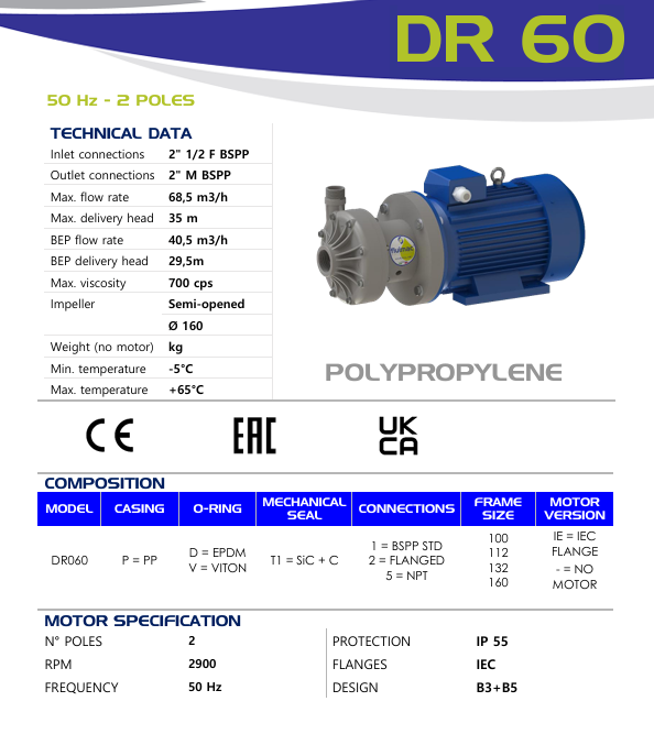 Odstředivé čerpadlo DR60 max. 68.5 m3/hod, max. 35 m, mat. Polypropylen, těsnění EPDM, 5.5 kW 2900 ot/min PP/EPDM
